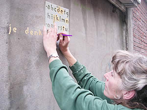 Mijn levens- en muziekpartner Anneke Rot (zie www.muzemakers.com), onze vriendin Ricky Geurds en ik huurden een “bed and breakfast” in het hartje van de stad en gingen aan de slag. In de Moordsteeg brachten we met kistletters in acrylverf bovenstaand gedicht Stegen aan; op een daklijst in de Nieuwesteeg het gedicht Droom en op een zwartgeteerde wand in koper-ogende plakletters “Oh straal voor mij! Ooit straal ik terug”; op een verwaarloosde, zeg maar blootliggende muur in de Niesenoortsteeg geslagen in een plaatje lood de regels “Wees jij mijn huid, ben ik jouw muur”; in de Griet Scheeljannessteeg met kleurige plastic plakletters het opschrift “Met de waan van de dag veegt de kunst de vloer aan”, en in de Tonnesteeg (tussen de Groote Noord en de Gooische Kade) in gele acrylverf op grauw cement met kistletters (sjablonen) het drieluik “Wat doet die dichter”, waarvan nummer III luidt “Ik voel je warmte./ Dat doen stegen./ Nu heb je het nooit meer koud hier./ Dat doen dichters.” Het werk is allemaal verzameld in miniboekje nr. 37 “Stegen zijn de menselijke maat”, zie websitehoofdstuk Dichter.