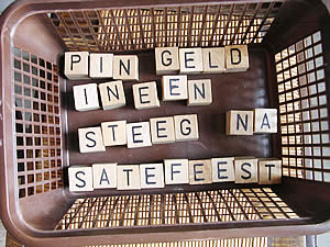 En dan nu een woord over het klapstuk van het project (afgezien van des dichters levende voordracht uit eigen werk naar keus van het publiek in een permanent bomvolle consistoriekamer): Het anagrammenproject “Geen fietsen plaatsen in de steeg”. Dit opschrift in de Gruttersteeg oogt te lelijk voor woorden en daarom heb ik er vele aan gewijd. Anneke en ik hebben er met behulp van letters uit het Scrabblespel 83 varianten op gemaakt, “anagrammen”, wat inhoudt dat we met precies die letters, niet meer en niet minder, nieuwe zinnen hebben bedacht. Zijn we lang mee bezig geweest. Anneke, puzzelverslaafde in aanleg, was niet te stoppen. Let op: